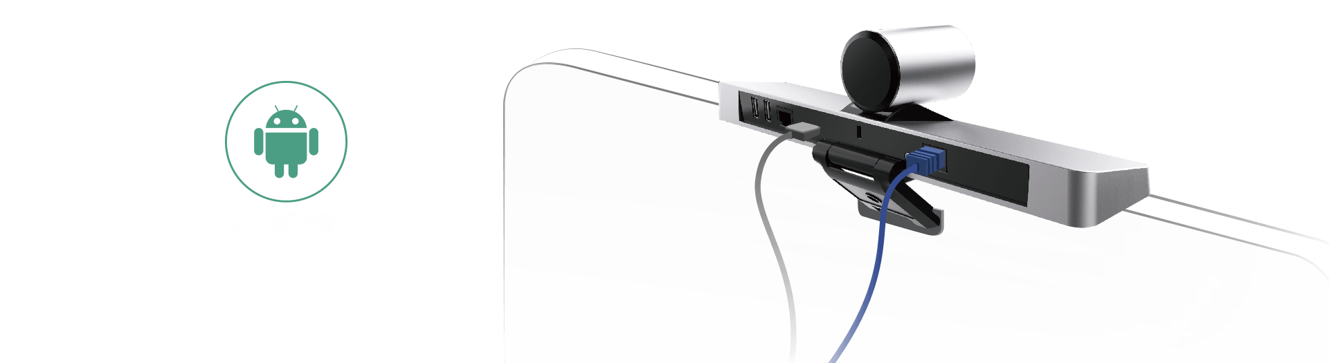 • 主机、摄像机、麦克风与挂架一体化设计,可直挂电视。挂架角度灵活可调,可适配6mm~50mm厚度的电视机;